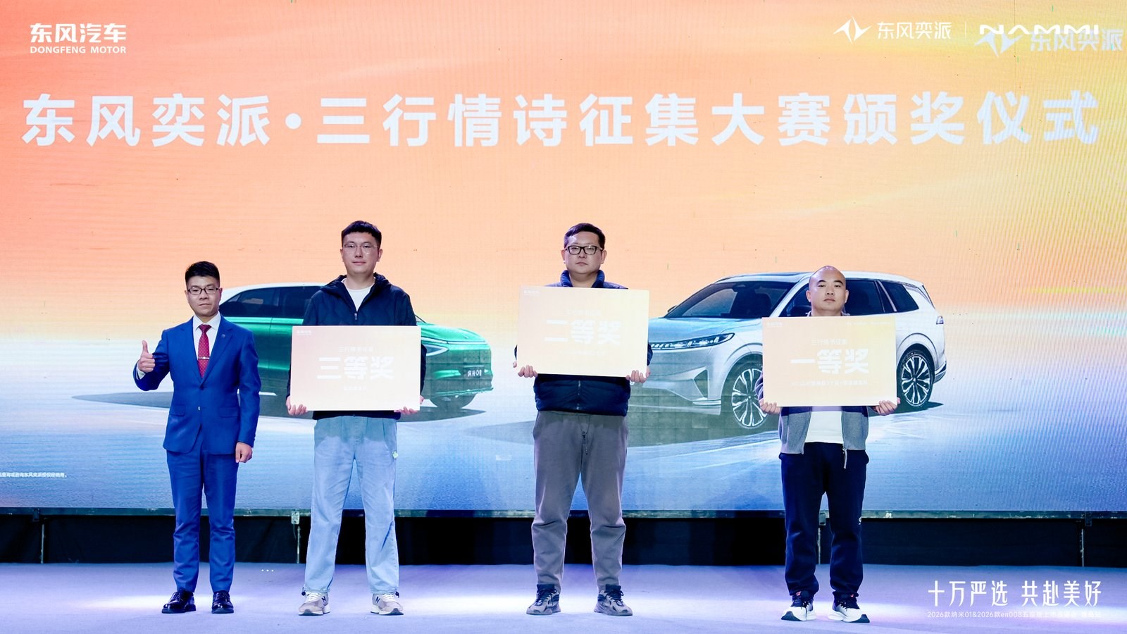 此外,东风奕派三行情诗大赛颁奖环节将氛围推向高潮,三位获奖者分别获得eπ008三个月使用权、奕派婚车队等浪漫礼遇。陈栋先生为获奖者颁奖时表示:“用诗歌传递爱意,用双车承载幸福,这是东风奕派对‘共赴美好’的承诺。”